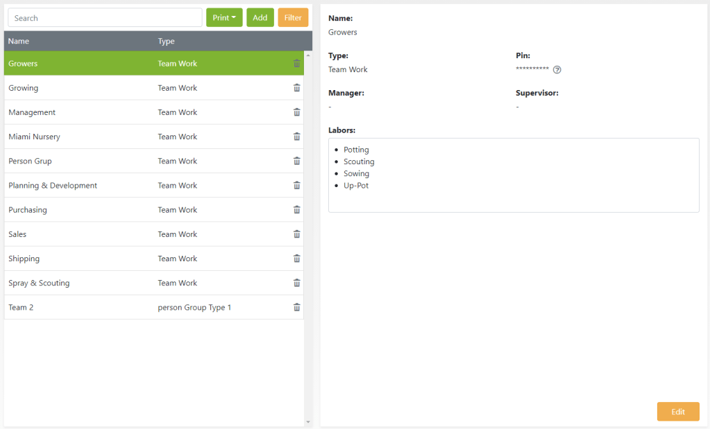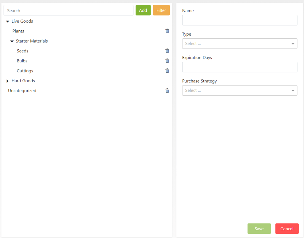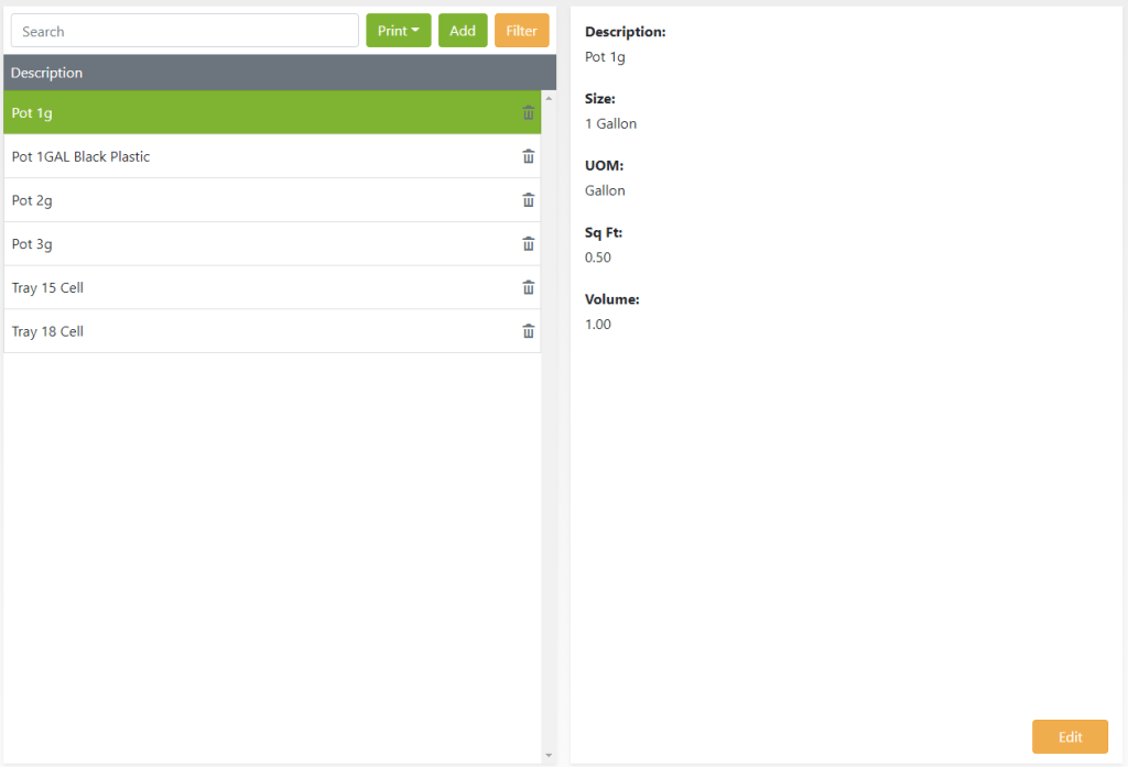 Our inventory system was designed to track plants in the fields, greenhouses, and warehouses. We keep track of lots, quantities, and availabilities across multiple locations, as well as all hard goods needed in the production process.
