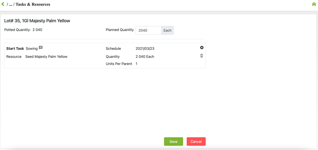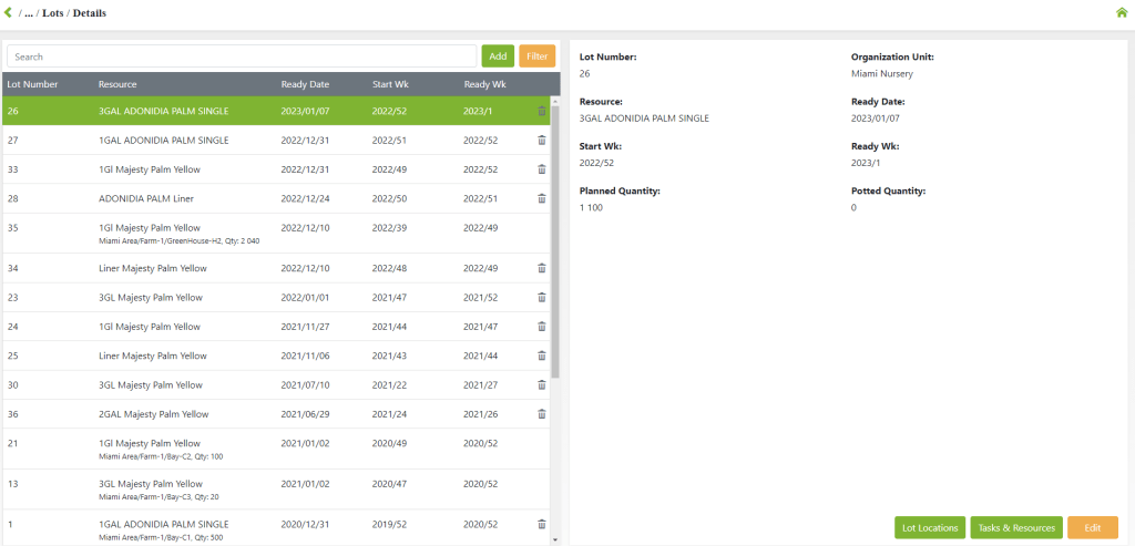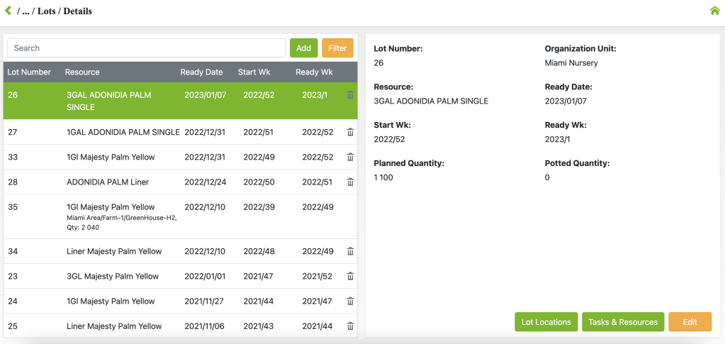 - Keep track of lot locations, planned vs potted quantity, ready date, dependencies, tasks, and resources.
