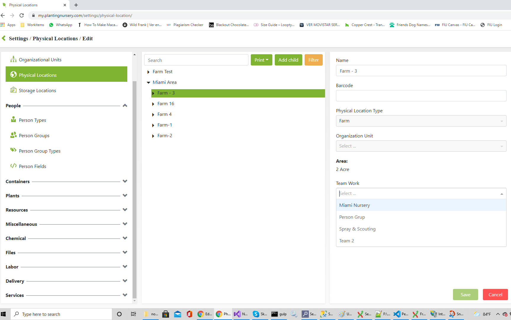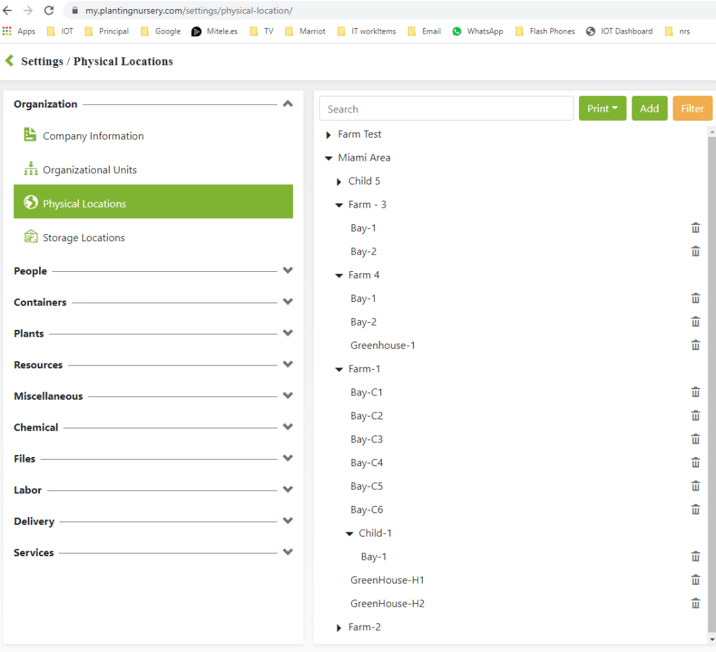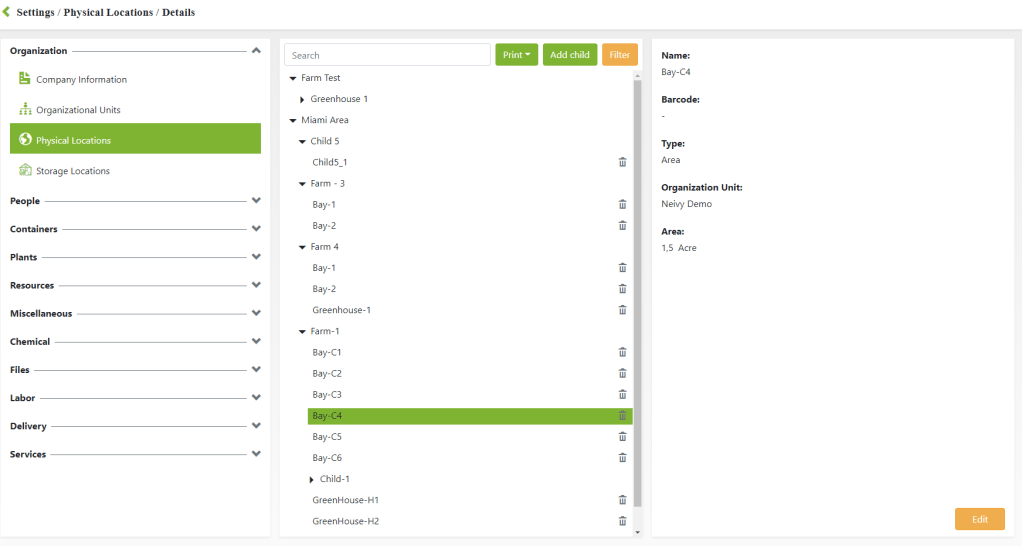 The Physical Locations section defines the different locations for a particular company including the Farms, Bays, and Greenhouses.