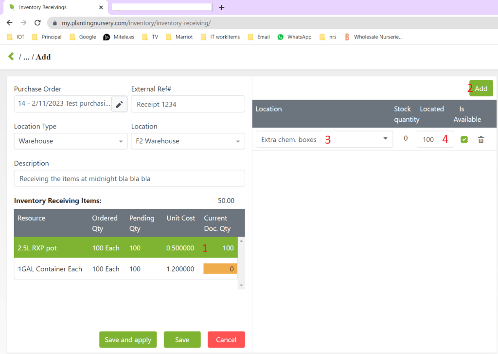 When the Receiving is completed with all final destinations, you can press Save(as a draft) or Save and Apply. This action will increase your inventory stocks. Now you can print the Receiving ticket (if needed)