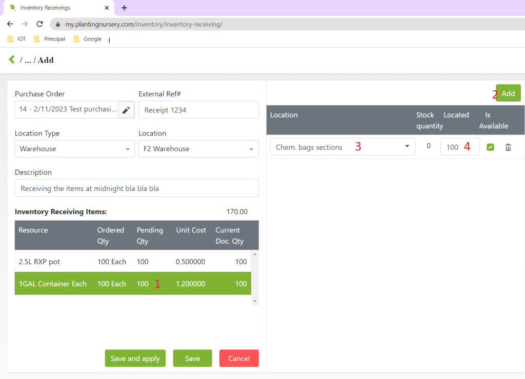 4- Type in the receiving quantity (the receiving could be total or partial, such as you can create a big purchase order in January and make partial receivings every month)