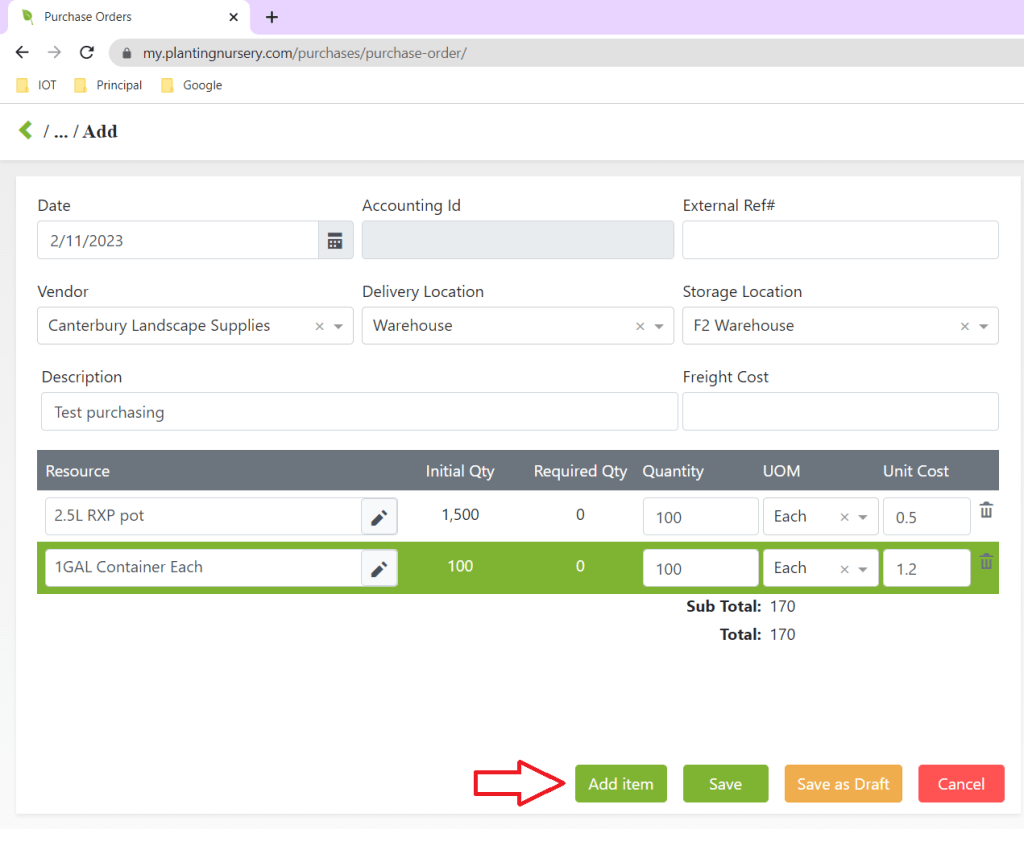 When the items arrives to the company (Warehouse, Greenhouse or Open bed, it depends on what kind of items you purchased)